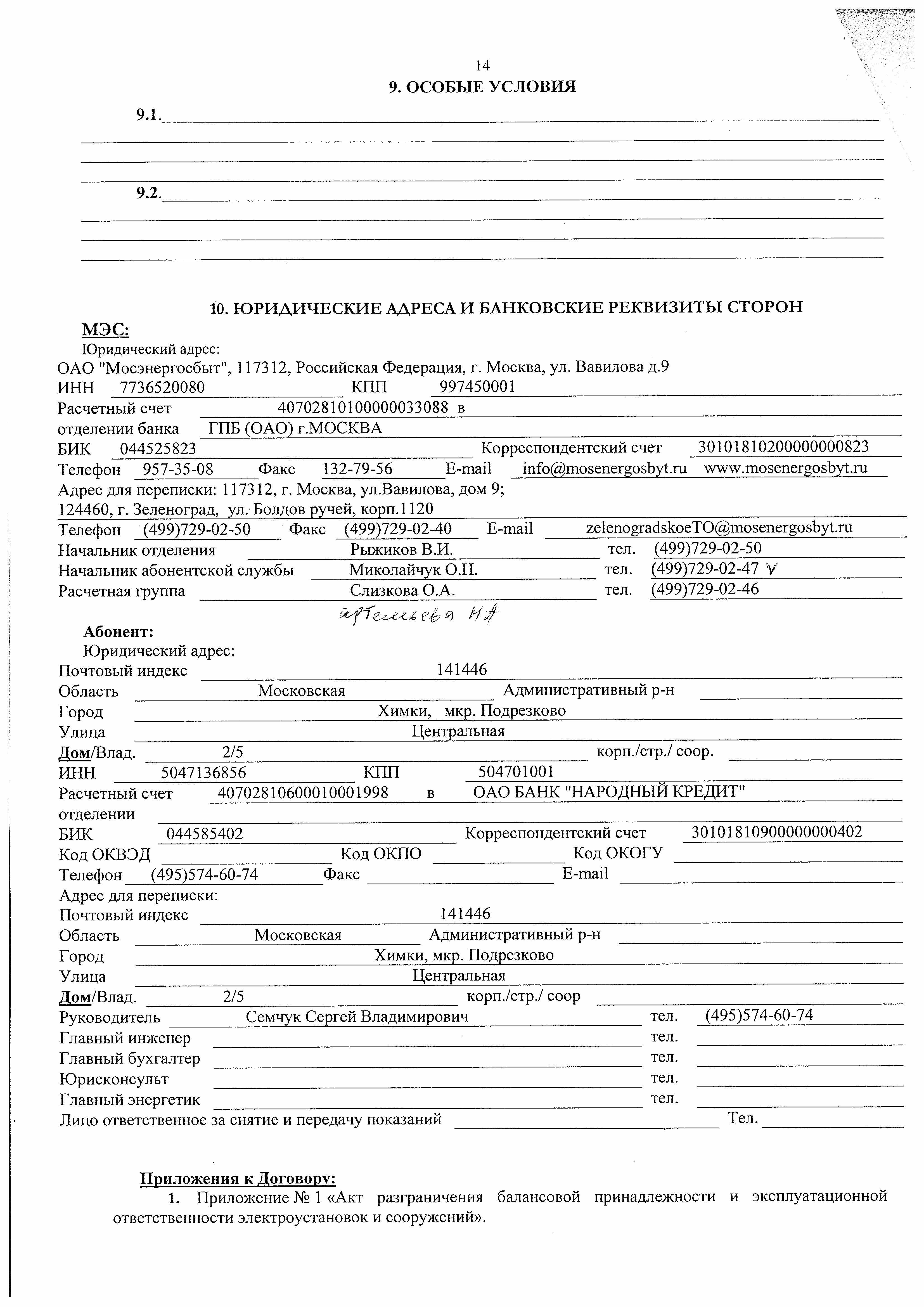 Договор электроснабжения ул. 1-я Лесная, д. 10 корп.1