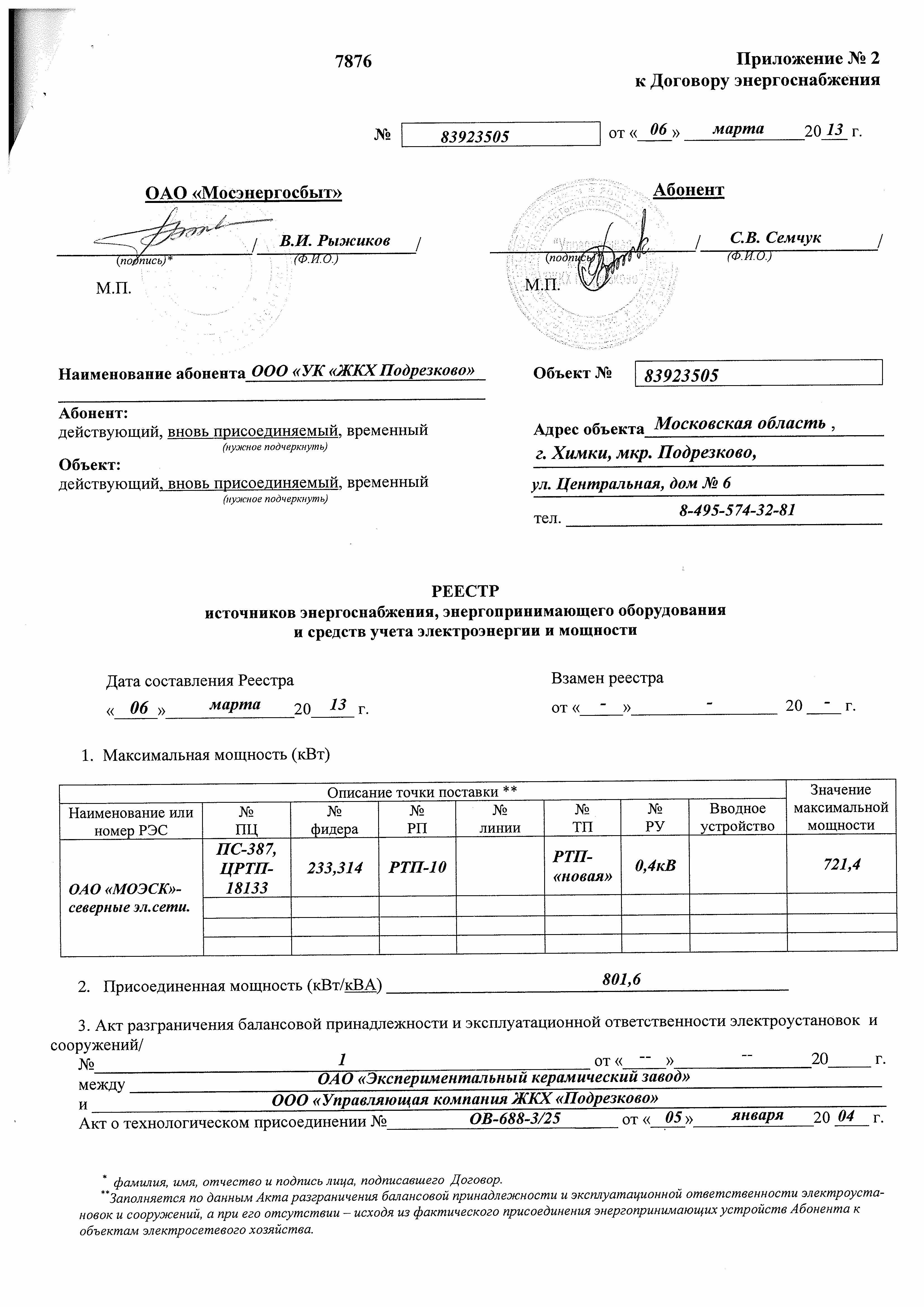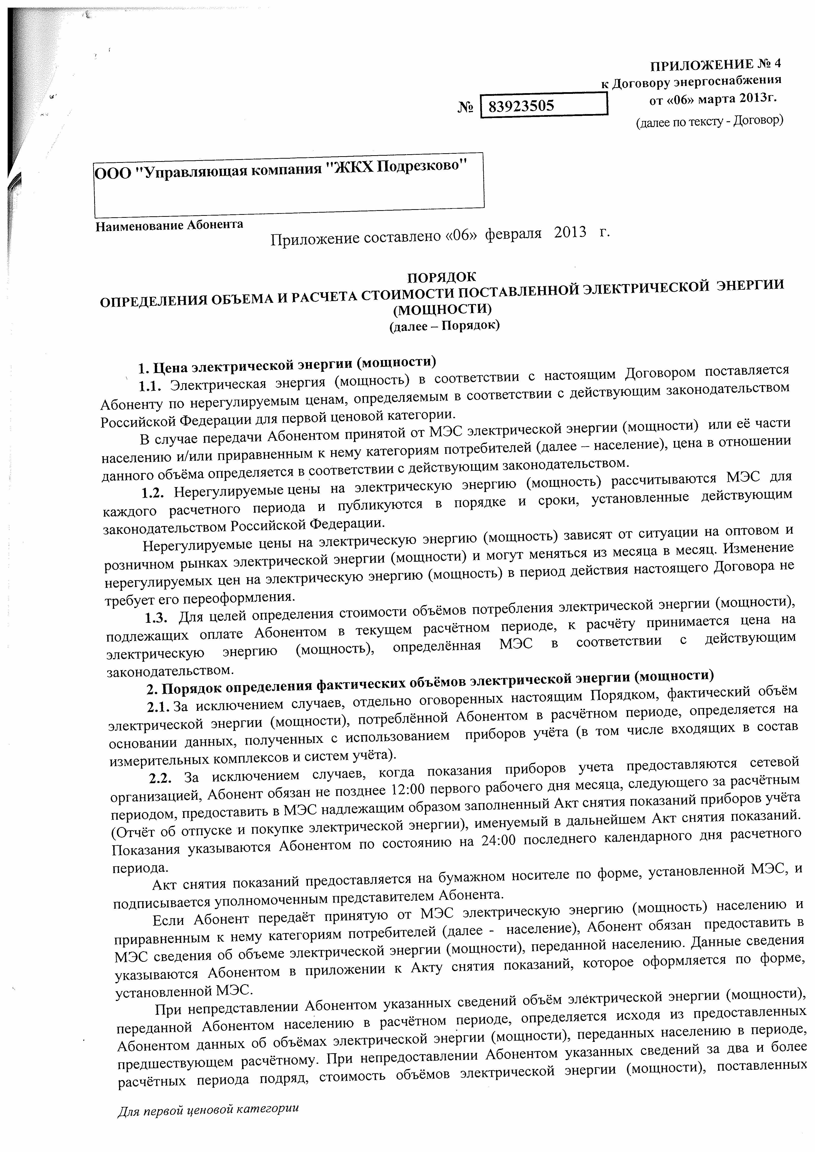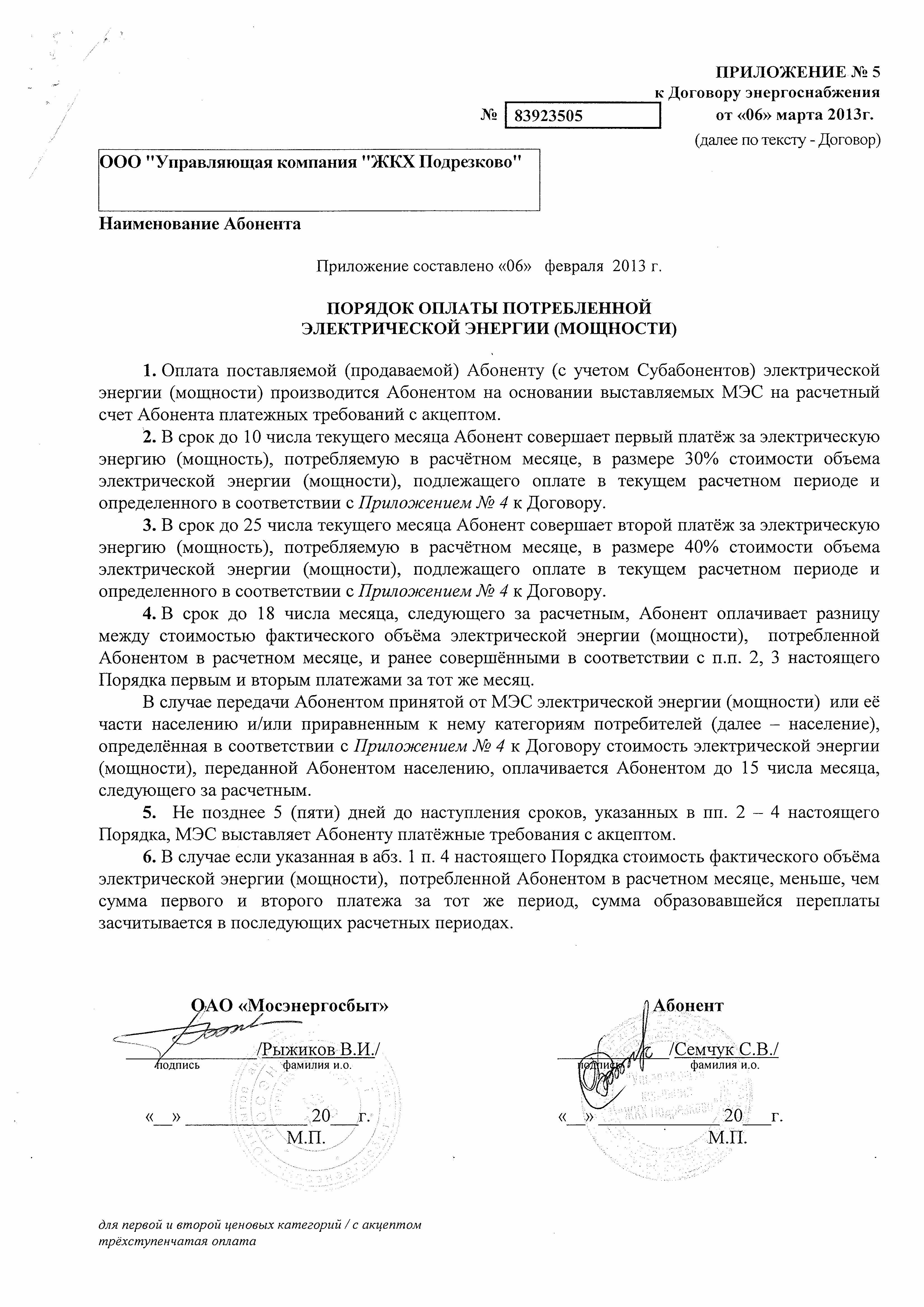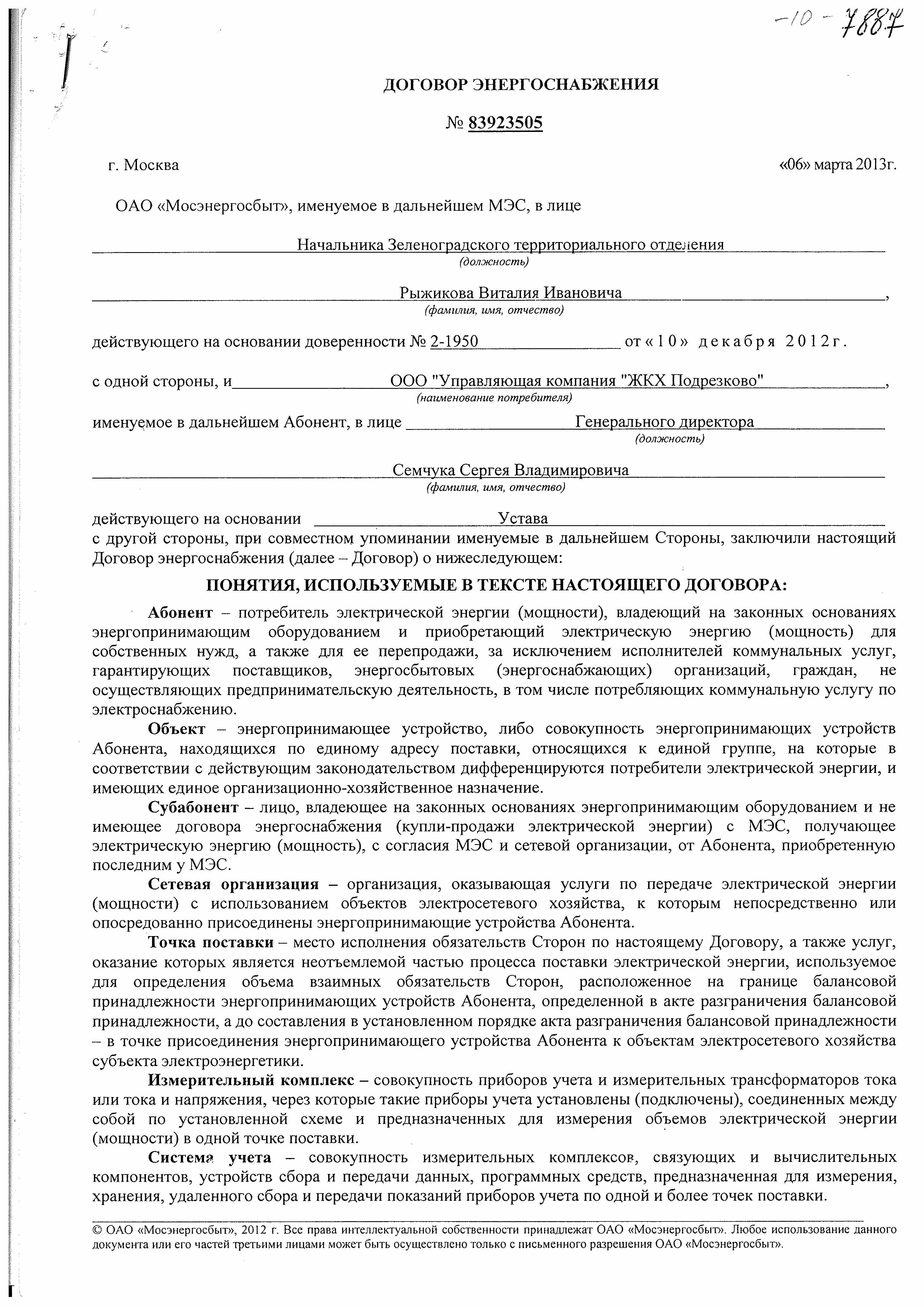 Договор Энергоснабжения между ОАО "Мосэнергосбыт" (МЭС) и ООО "УК ЖКХ "Подрезково" от 06.03.2013 № 83923505