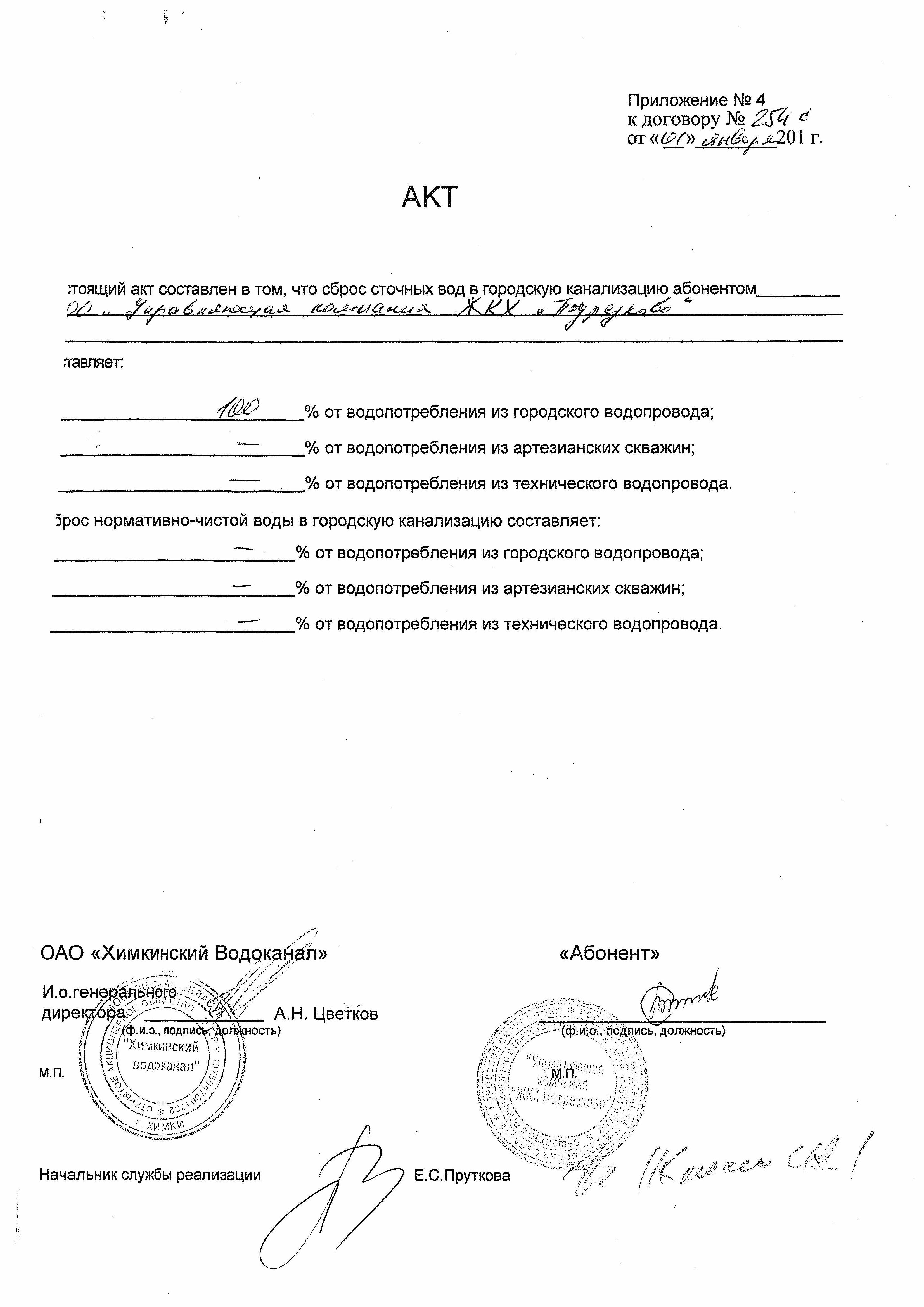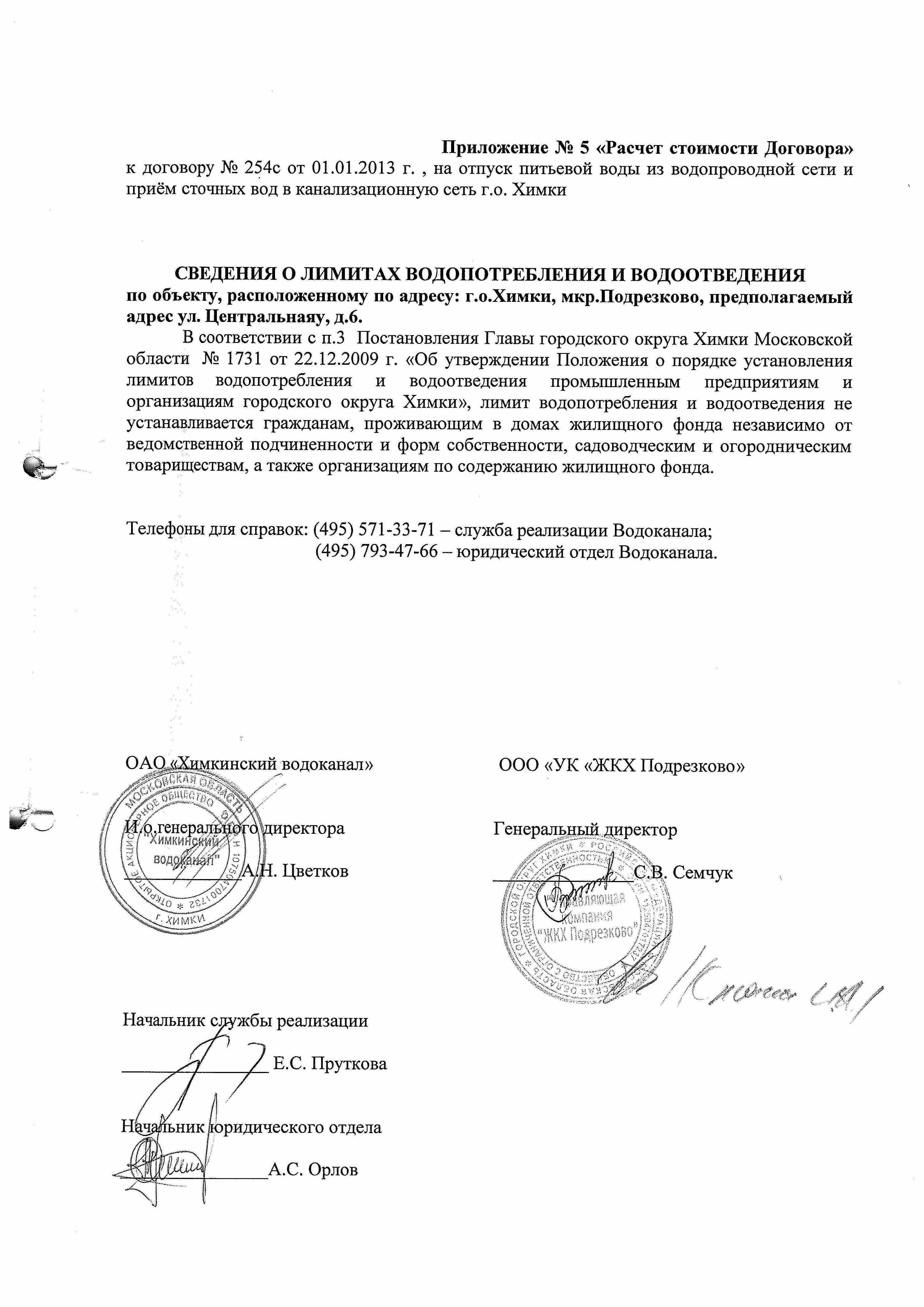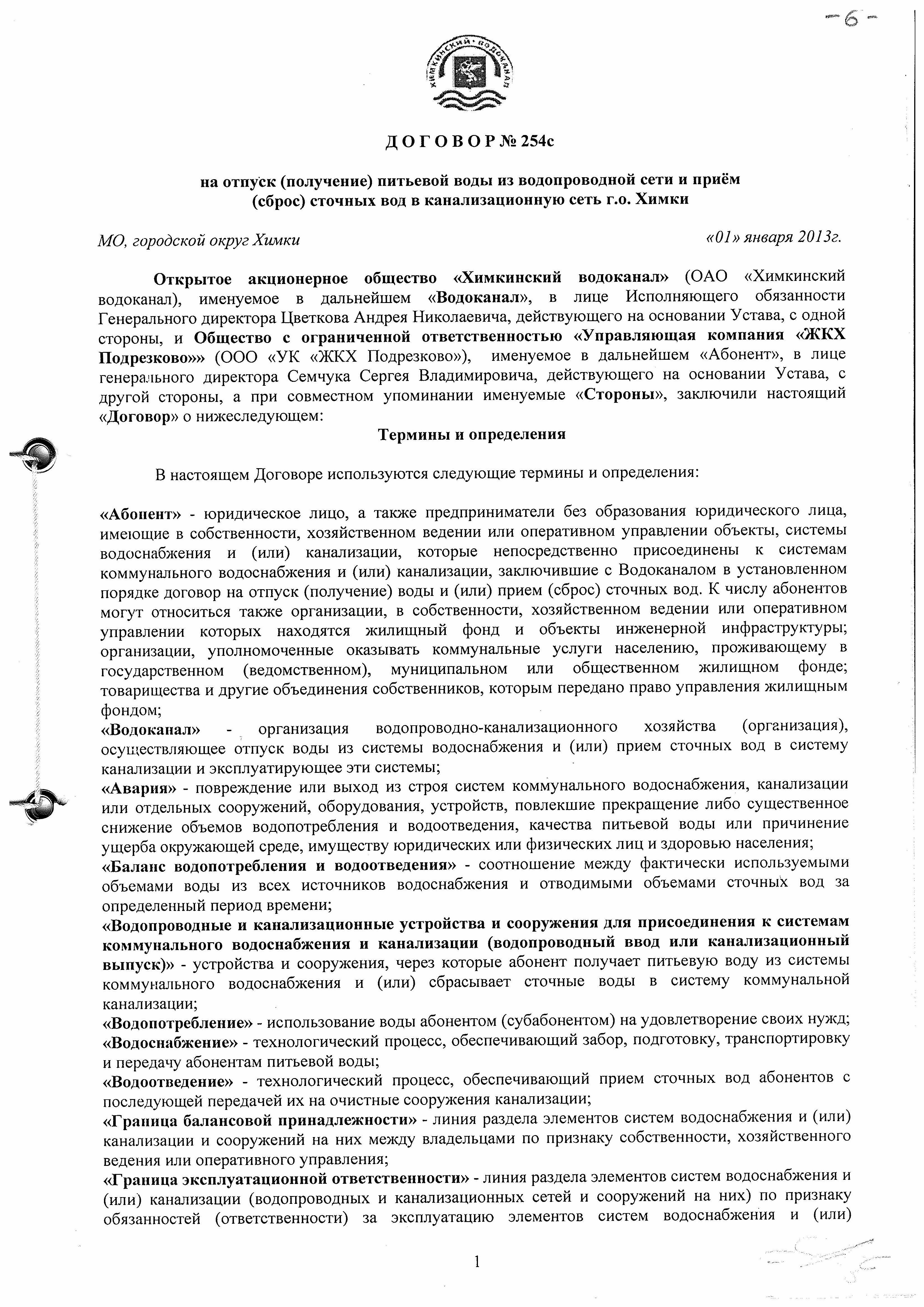 Договор между ОАО "Химкинский водоканал" и ООО У"УК ЖКХ "Подрезково" от 01.01.2013 № 254-с на отпуск (получение) питьевой воды из водопроводной сети и приёкм (сброс) сточных вод в канализационную сеть г.о. Химки