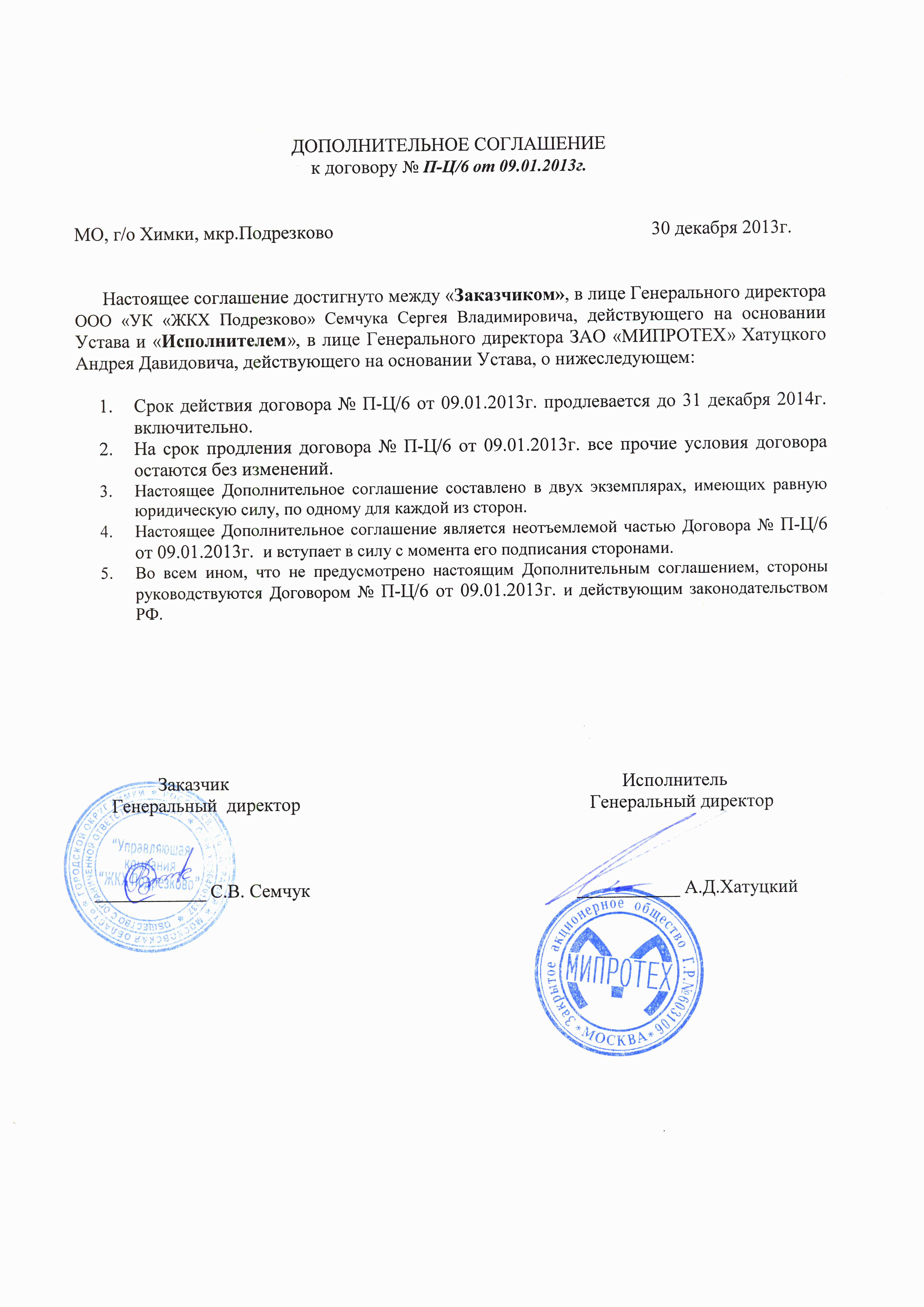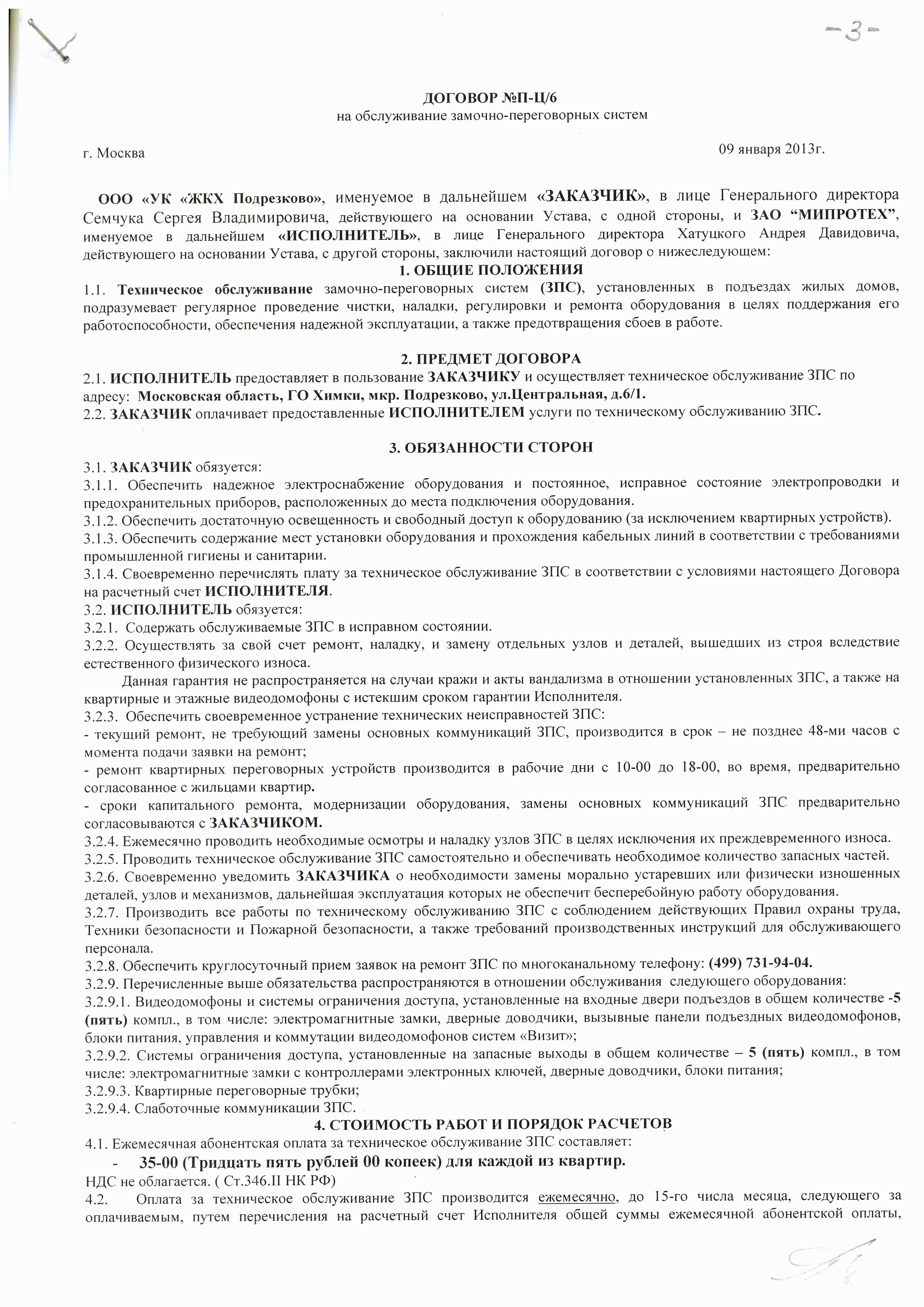 Договор между ЗАО "Мипротех" и ООО "УК ЖКХ "Подрезково" от 09.01.2013 № П-Ц/6 на обслуживание замочно-переговорных систем