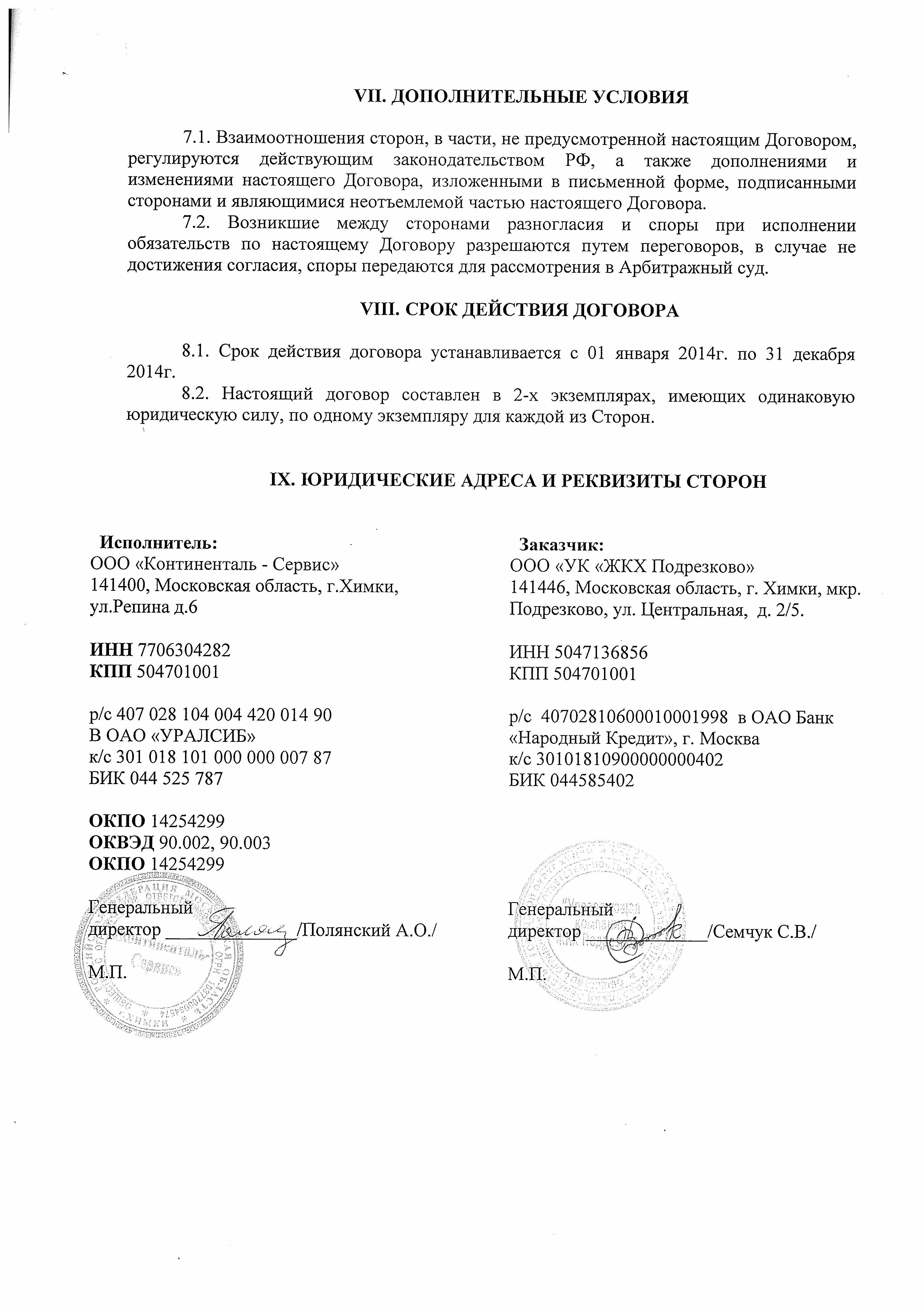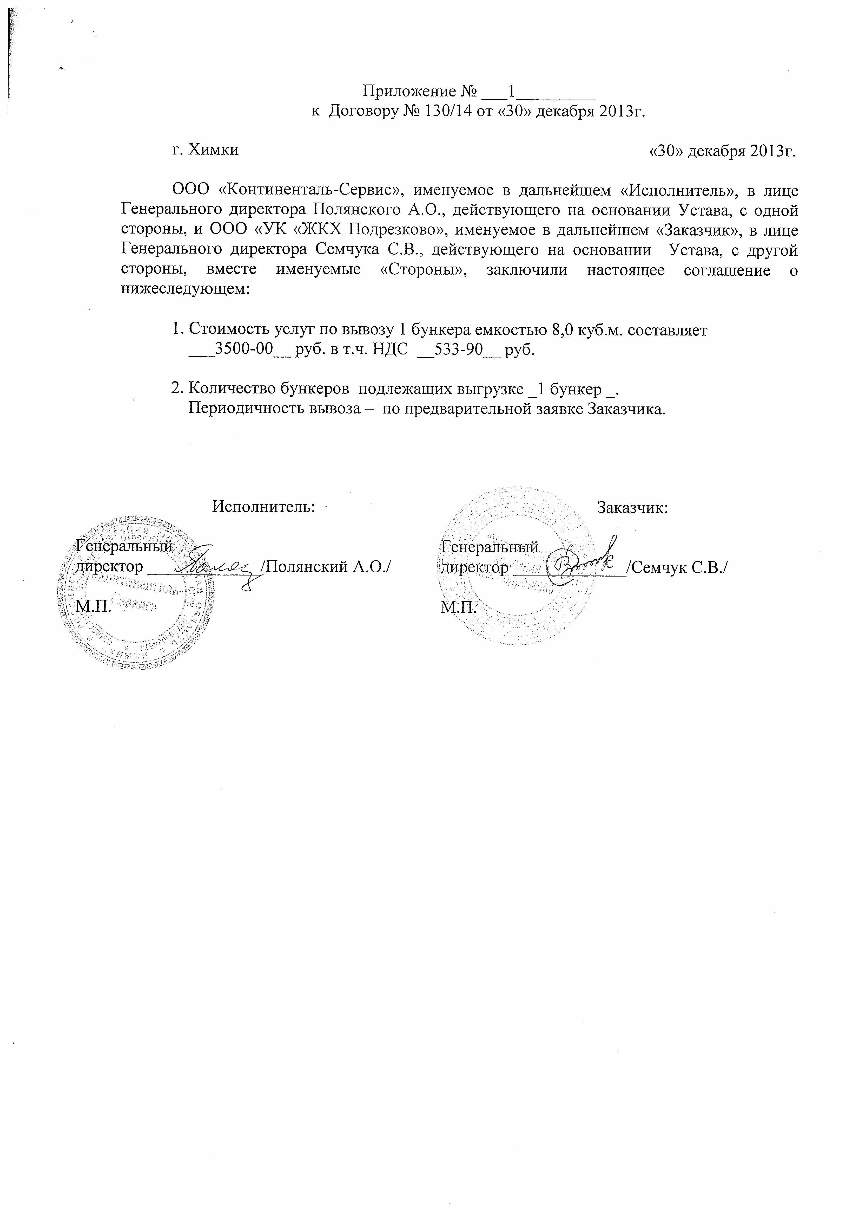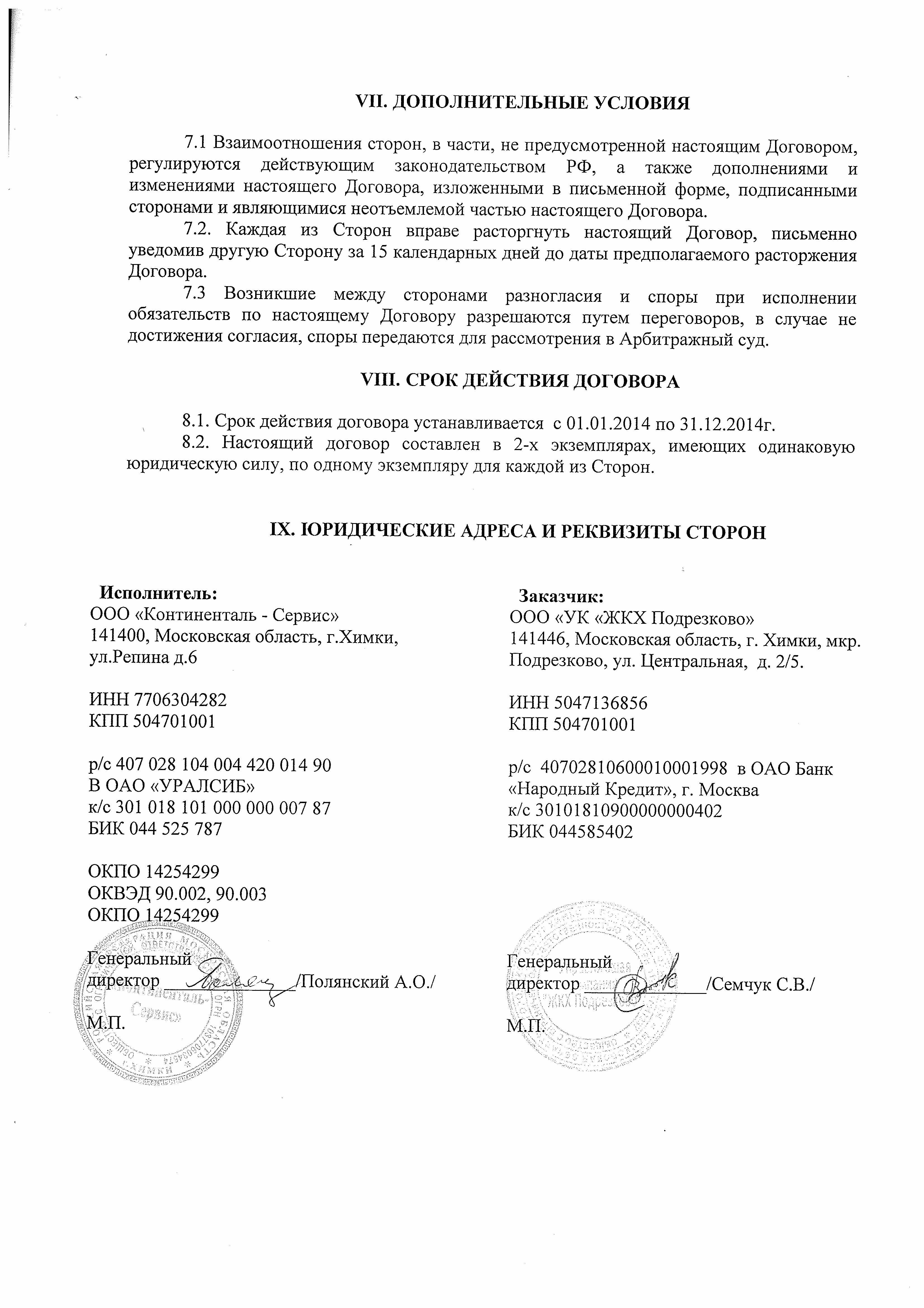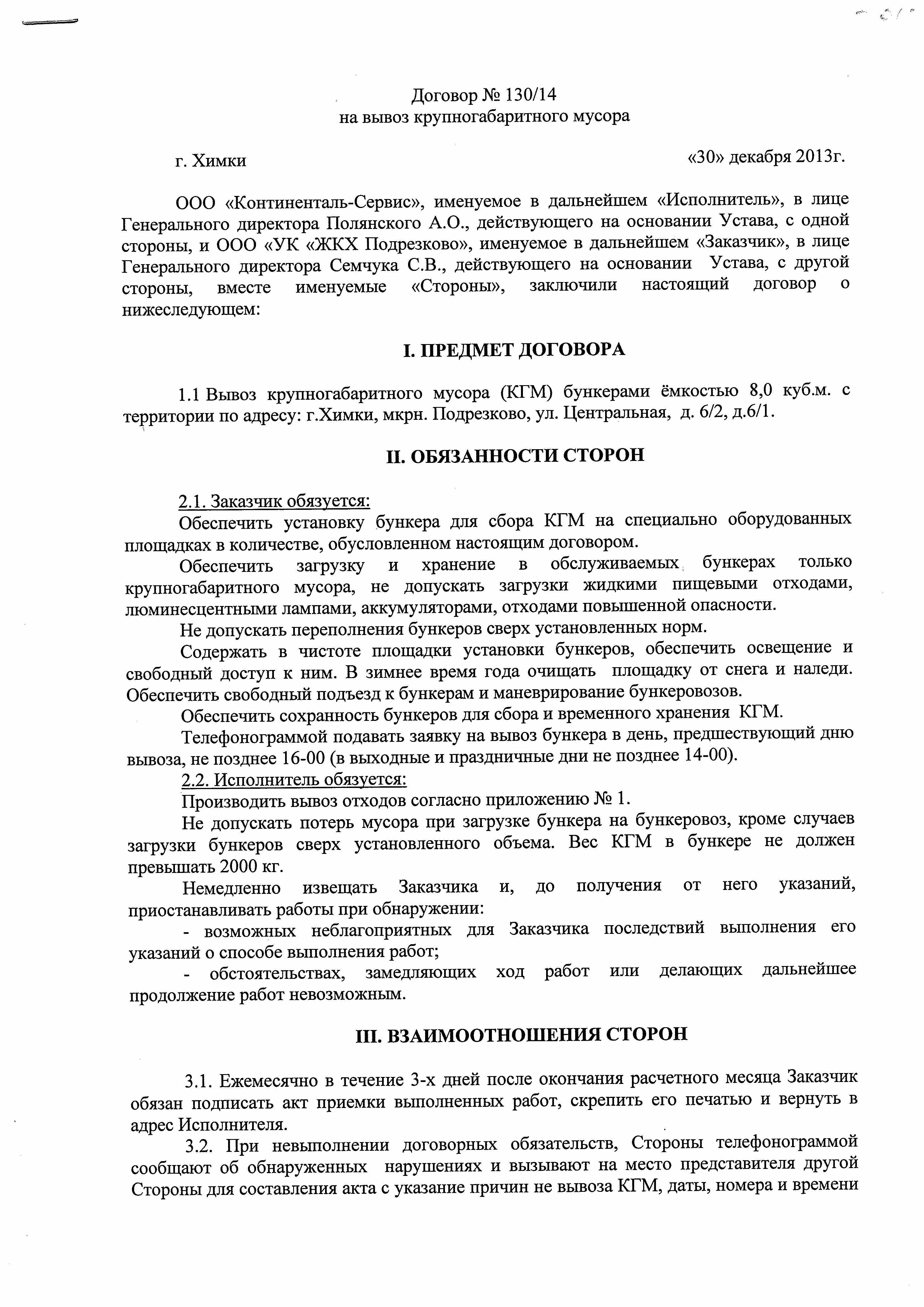 Договор между ООО "Континенталь-Сервис" и ООО "УК ЖКХ "Порезково" от 30.12.2013 № 130/14 на вывоз КГМ