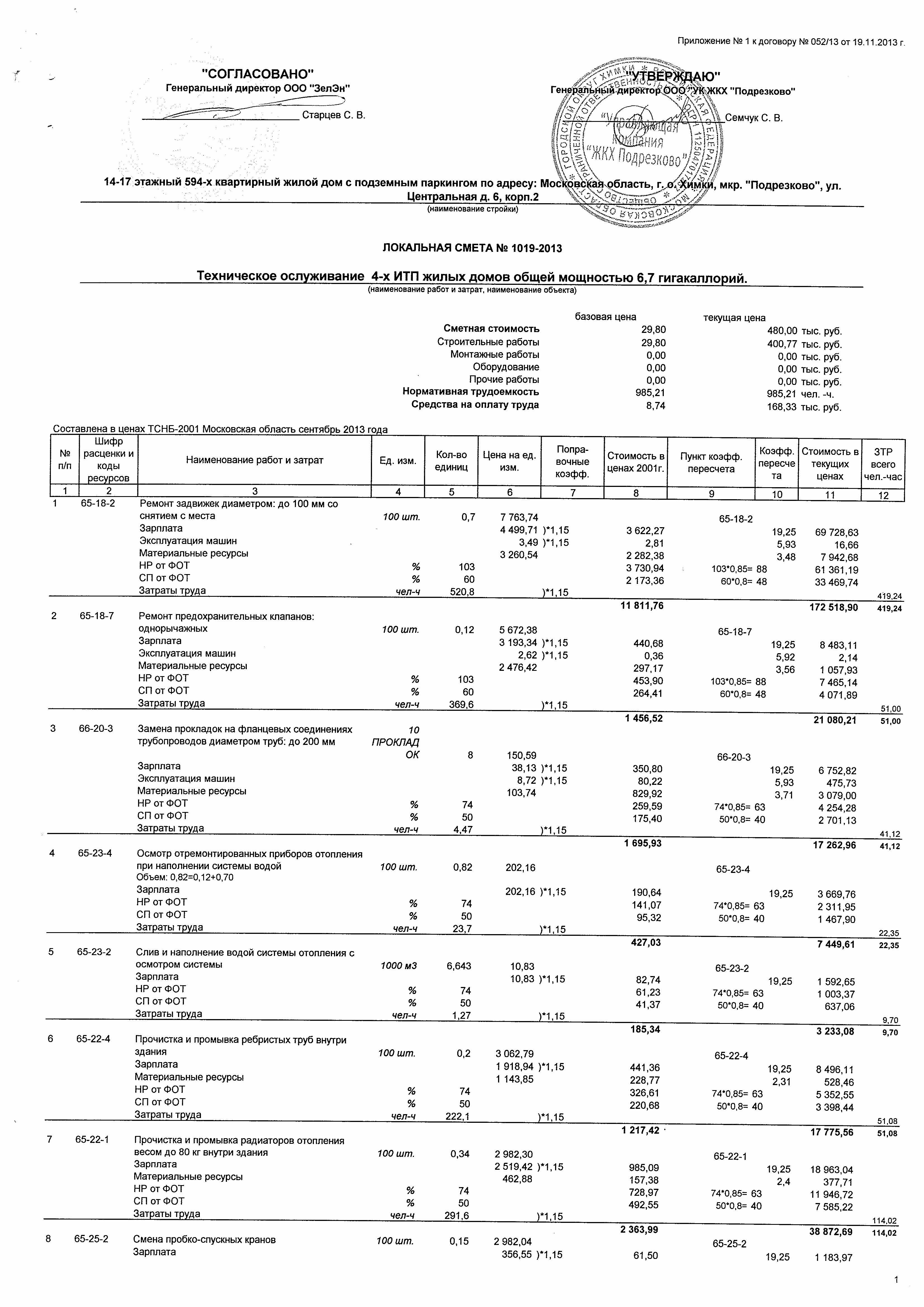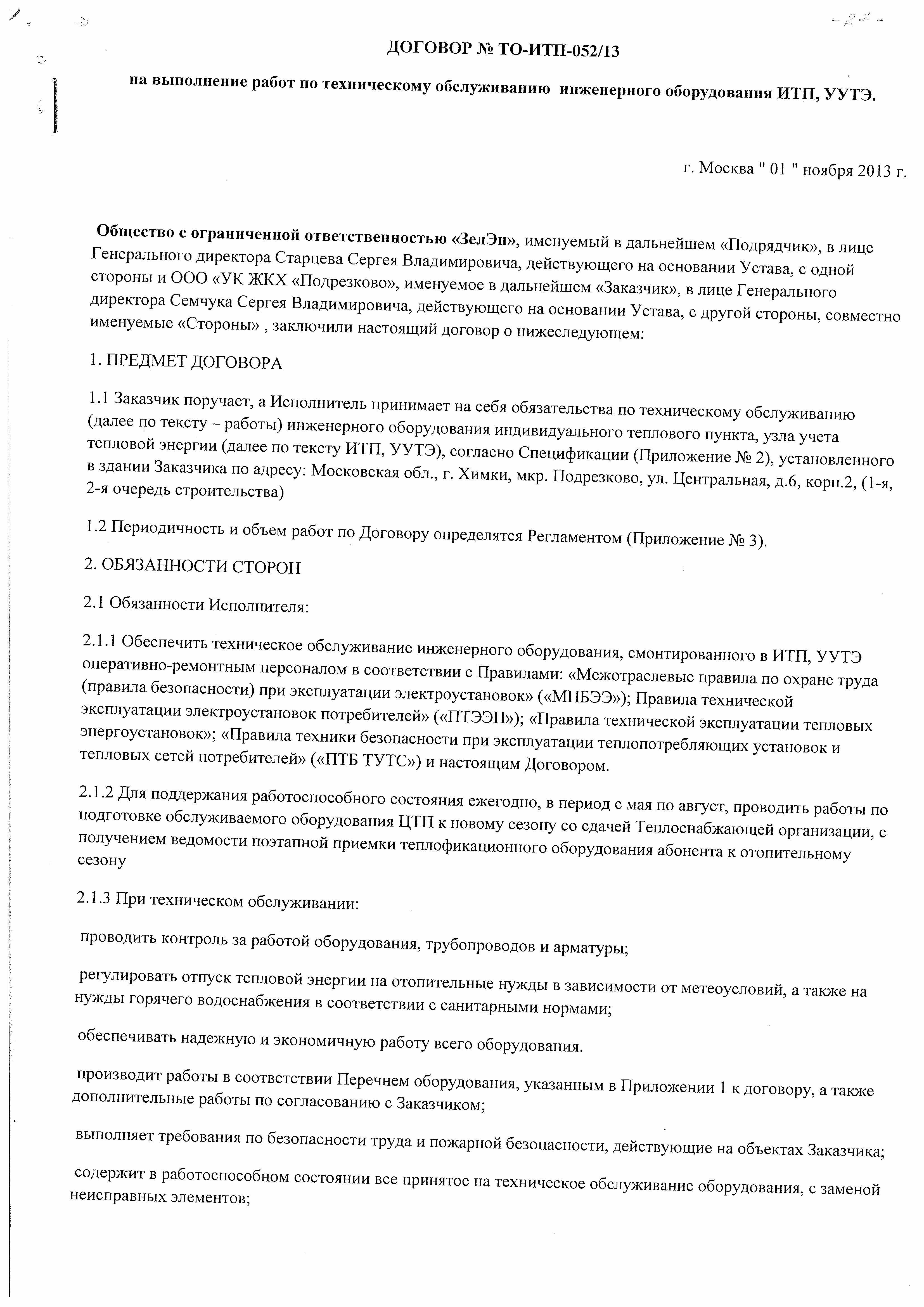 Договор между ООО "ЗелЭн" и ООО "УК ЖКХ "Подрезково" от 01.11.2013 № ТО-ИТП-052/13 на выполнение работ по техническому обслуживанию инженерного оборудования ИТП, УУТЭ