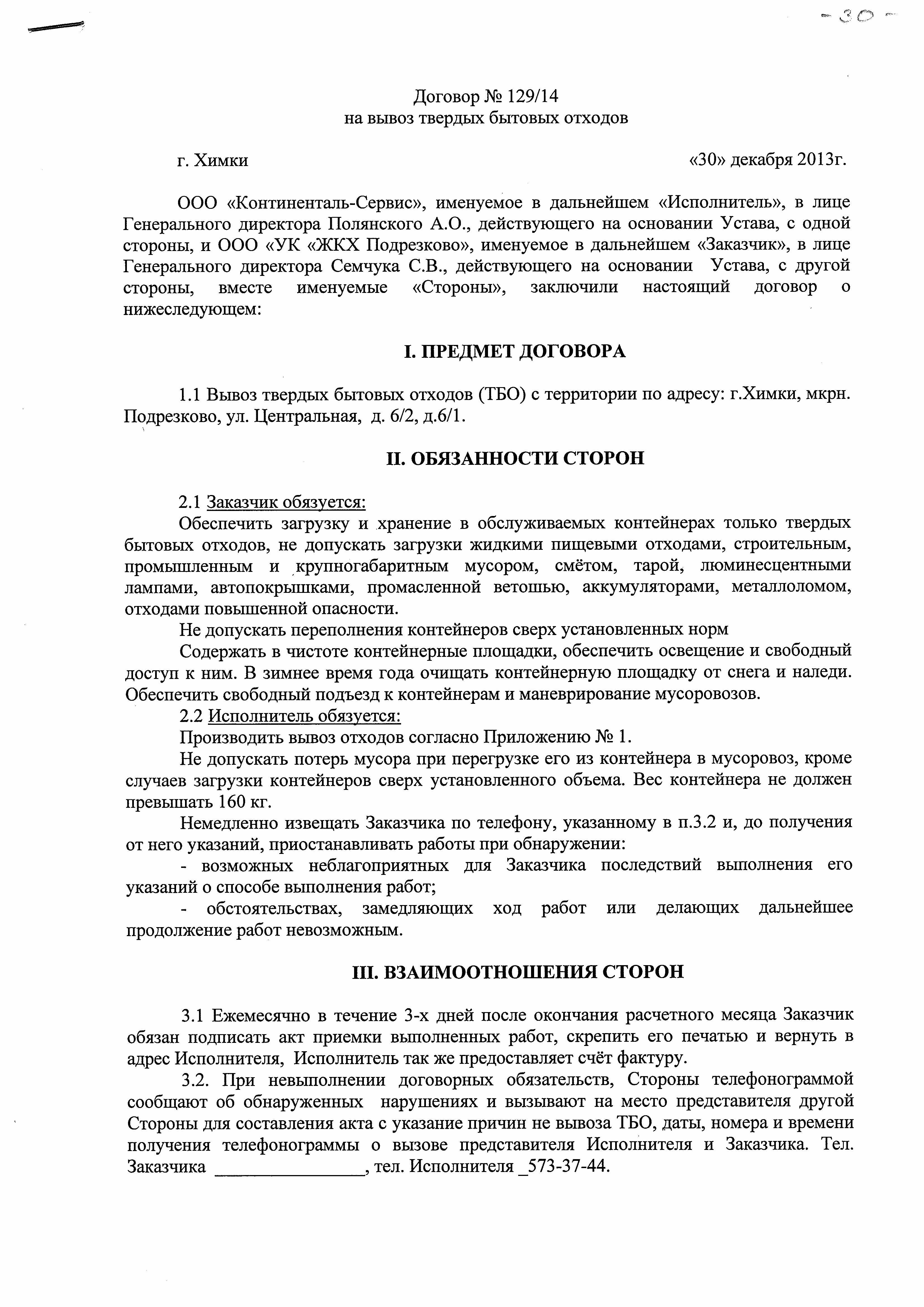 Договор между ООО "Континенталь-Сервис" и ООО "УК ЖКХ "Подрезково" от 30.12.2013 № 129/14 на вывоз ТБО